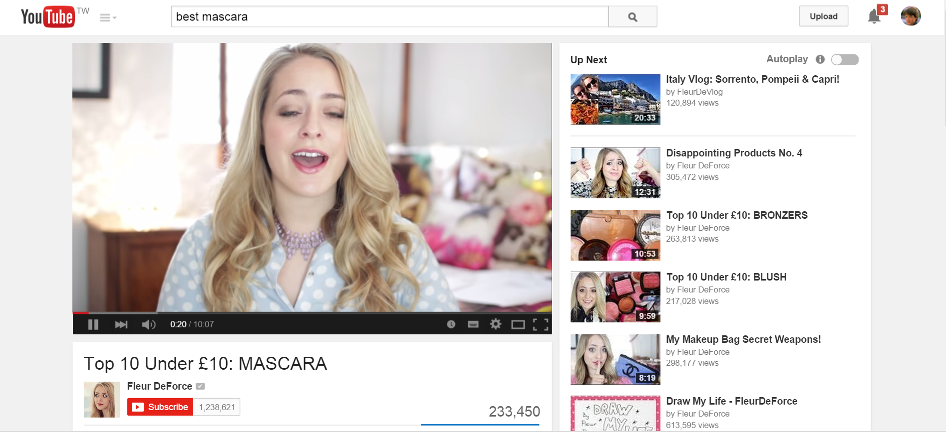 I decided to go back to the video and watched it through to the end (see Fig 9). After viewing the video, I knew exactly which was the best mascara to buy for under 10 pounds! Not only that, but I visited my YouTube homepage and found recommendations from this particular channel (see Fig. 10).