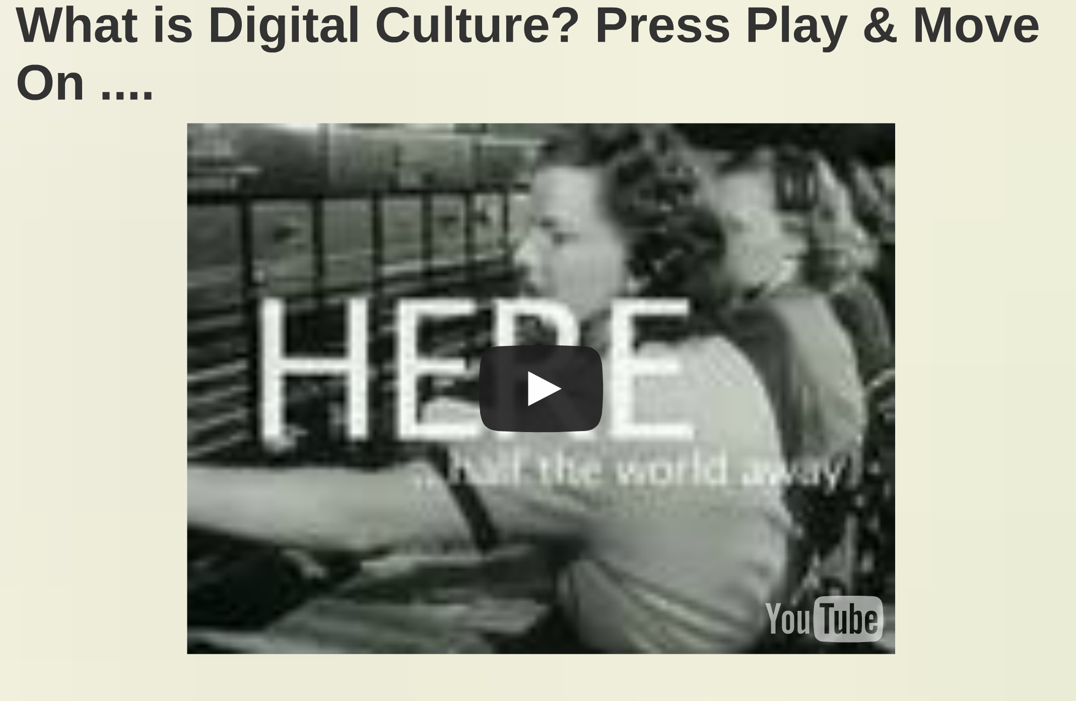 Youtube film: This was selected in order to highlight the playfulness and irony that, according to Haraway (2007) and Hayes (1999), are key features of post-humanism and digital culture more broadly. Also, aligning with the notion of the mashup, the video is intended to provide a background track (Anything goes) to run through the remainder of the display.